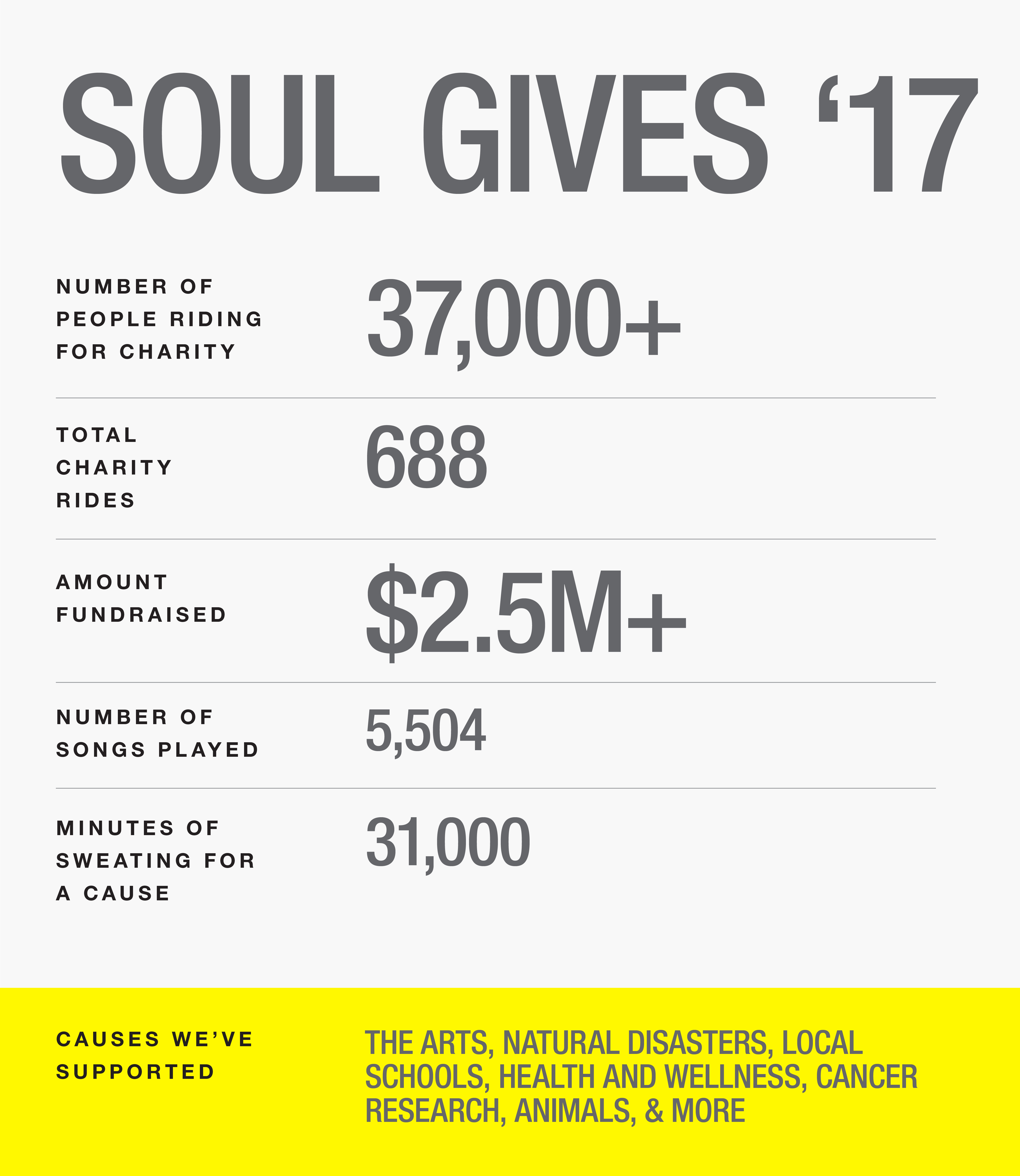 Since launch, SoulCycle has hosted charity rides that provide organizations both large and small the opportunity to come together and raise money in a fun and inspiring way - a SoulCycle class. Through these rides, SoulCycle helps raise more than $2.5M each year for much-needed causes. For more information, or to host a ride at SoulCycle, please email charity@soul-cycle.com.